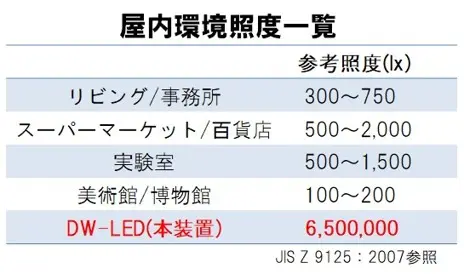 屋内環境(500ルクス程度)の1万倍以上の照度環境を実現しました。